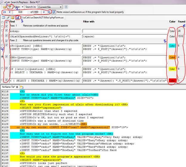 The section at top is the transformation code. If you either load or paste this HTML code into uCalc Search, and then click the Filter button, you get the auto-generated php code that you see at the bottom (the list of auto-generated code goes beyond the snapshot posted here). Had the original HTML code been cleaner, this could have taken fewer lines. But my goal was to work with the original code, just the way it was. So in Pass 1, I have it strip out unsightly occurrences that were in the original, as well as newline and tab characters, which I didn’t want imbedded in the question strings. Some INPUT TYPE questions were located between <P> and an optional <BR> while others came after <BR>, which is why I have two lines to capture INPUT TYPE patterns. SELECT and TEXTAREA type questions tended to be imbedded between a <P> which sometime had extra attributes (denoted by the optional [{etc}]) and sometimes a <BR>. Some SELECT or TEXTAREA questions didn’t quite match those patterns, so the last line catches the rest of them. For those, it uses the variable name in place of the question.